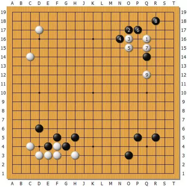 图5:贵阳弈源第73手暂停的时候,我们研究的是白1立的下法,黑2挡必然,黑4~8将白棋断开,白如果在9位扳,黑10断,这样将白棋滚包之后黑棋中央有望成大空,白棋无法杀掉黑左上角的棋,黑棋明显优势。